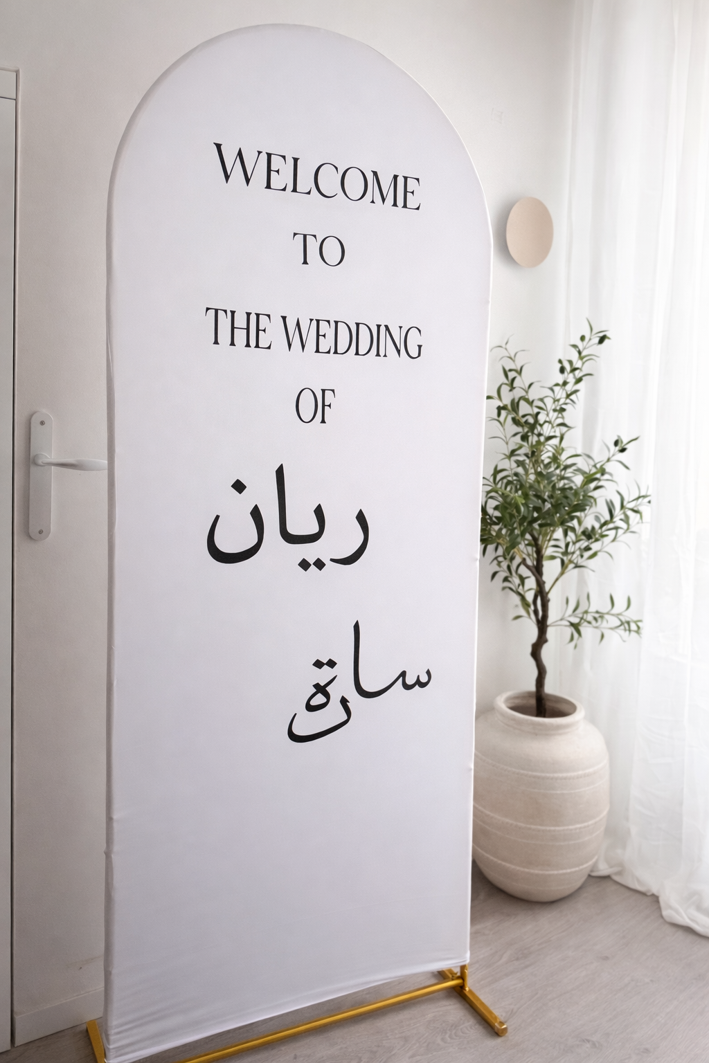 Personnalisable avec les prénoms des mariés (en français, arabe ou mixte) et le texte de votre choix, il s’adapte à tous les styles : mariage oriental, bohème, minimaliste ou chic.